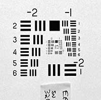 Resolution tests were run at varying distances from the target. An Edmund Scientific lens resolution chart was illuminated with a monolight flash adjusted with a flash meter at each aperture exposure. The lenses were mounted on a Bogen 3033/Arca Swiss B1 tripod/head combination with a large Kirk bean bag weighing down the tripod/head to dampen vibration. Three exposures at 1/250th second were taken at each aperture with an EOS-1v via cable shutter release on Kodak Technical Pan film rated at ISO 25 and developed in Technidol. The central autofocus point was centered over the center pattern for each exposure. No focus bracketing was used. In previous tests, it was determined that camera autofocus function yielded consistently higher line pairs per mm scores than trying to use manual focus and bracketing with an eyepiece magnifier. The lens was manually defocused, and then refocused using autofocus for each exposure. Line patterns were read under a compound brightfield microscope at a magnification of 40X.