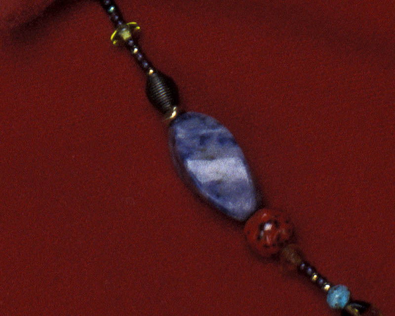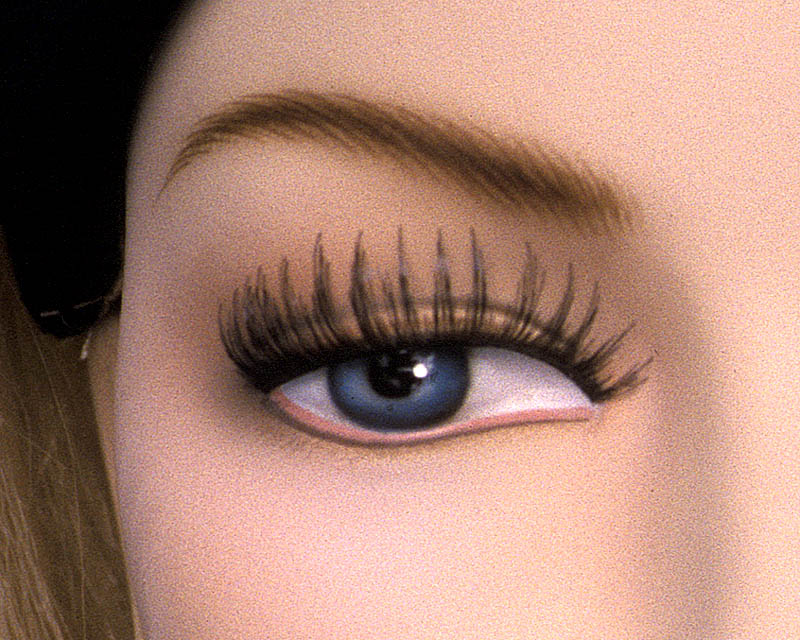 Comparison of EOS-1Ds Mark II against EOS-1Ds on same day. Other images shot on two other days: EOS-1D Mark II, 35mm format, 6x7 format. The main objective was comparison of image detail. There are variations in exposure, color balance, and contrast introduced by the photographer. Image detail cut from negative scan or raw converted file at 300 dpi. Cropped section converted to 72 dpi 800 x 640 pixel image. Canon images shot with Canon 50mm f/1.4 lens at f/11 for digital cameras at ISO 200 and f/8 for Astia at ISO 100. Mamiya 7 used with 80mm f/4 lens at f/8 with Astia. Negatives scanned on Nikon 4000 ED and Nikon 8000 ED scanners with autoexposure function and post-scanning levels, contrast and brightness. All images subjected to varying levels of sharpening for maximal sharpening without gross distortion. The 6x7 negative format image was cropped because the lens was working at minimum focusing distance and was still not achieving full frame of head and chest. The test with the EOS-1D Mark II was run at a second time under approximately the same lighting conditions. The shirt had been washed 3-4 times and had lost some of its even texture and color. White balance was set with a grey card for the EOS-1D Mark II. The tests with the EOS-1Ds and 1Ds Mark II were run at a 3rd time with similar soft box and triflector, but no hairlight or background and background light. White balance is custom set off grey card.