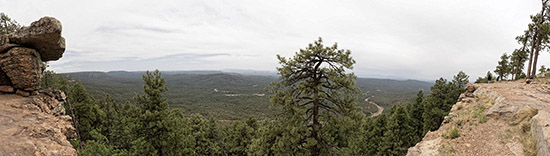 Panorama image from the Mogollon Rim towards Payson at the Rim Lakes Vista Overlook off AZ 260. Coconino Sandstone predominated at the area I stopped. |