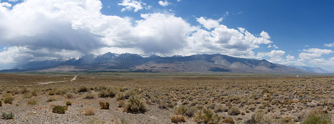 Panoramic view of the Eastern Sierra Nevada from Big Pine Vista Point. I drove from Beatty NV through Westgard Pass between the Inyo and White Mountains on CA 168 through stunning volcanic terrain before stopping at this beautiful vista point. |