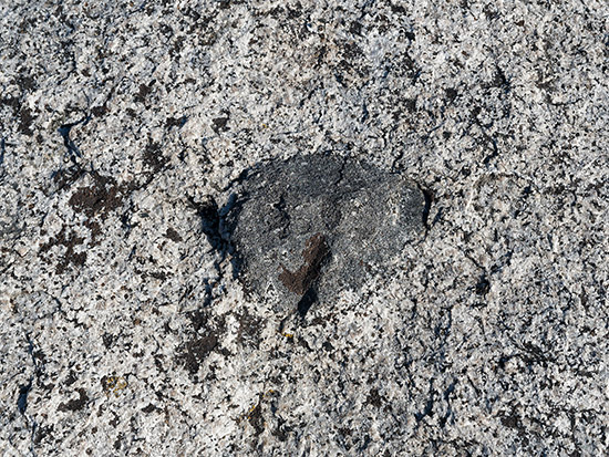 Dark inclusion in white granite (or diorite inclusion in granodiorite.) These are explained as partially-melted basalt or other rock bordering the main magma chamber where the granite batholith cooled. Olmsted Point |
