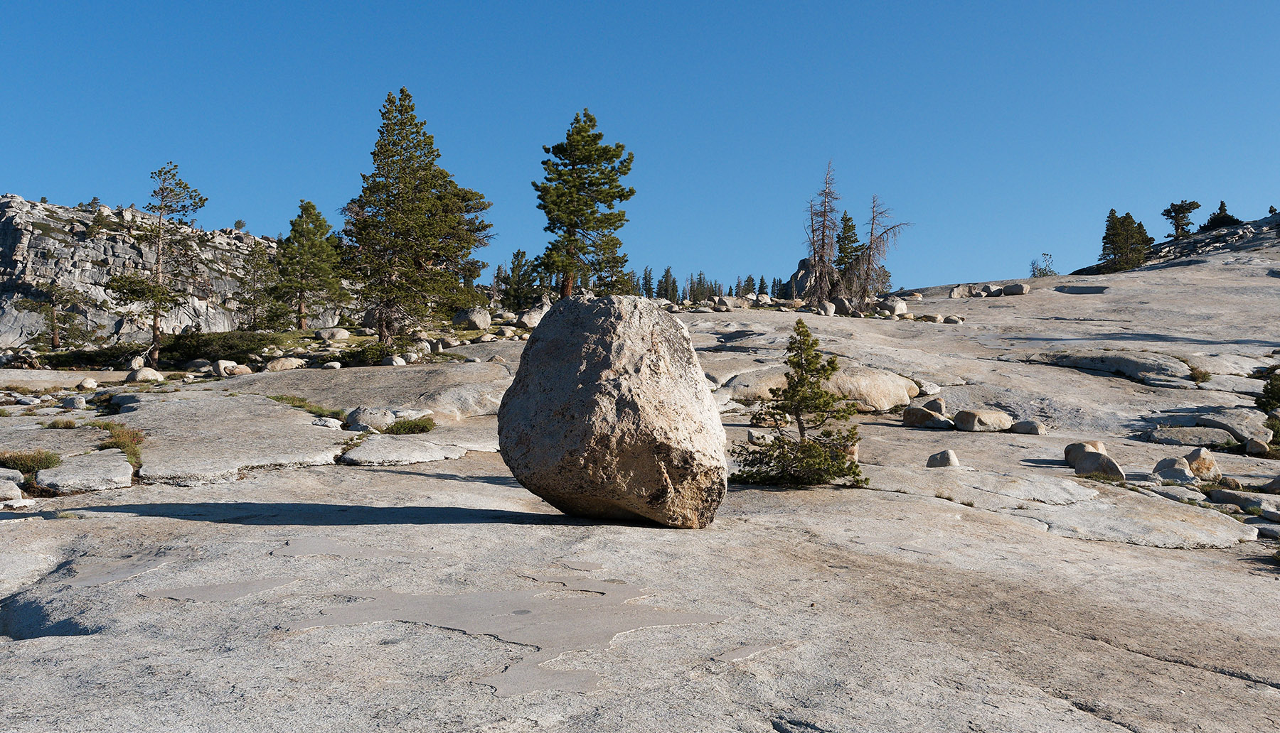 Granite glacial erratic boulder sitting on polished granite at Olmsted Point. |