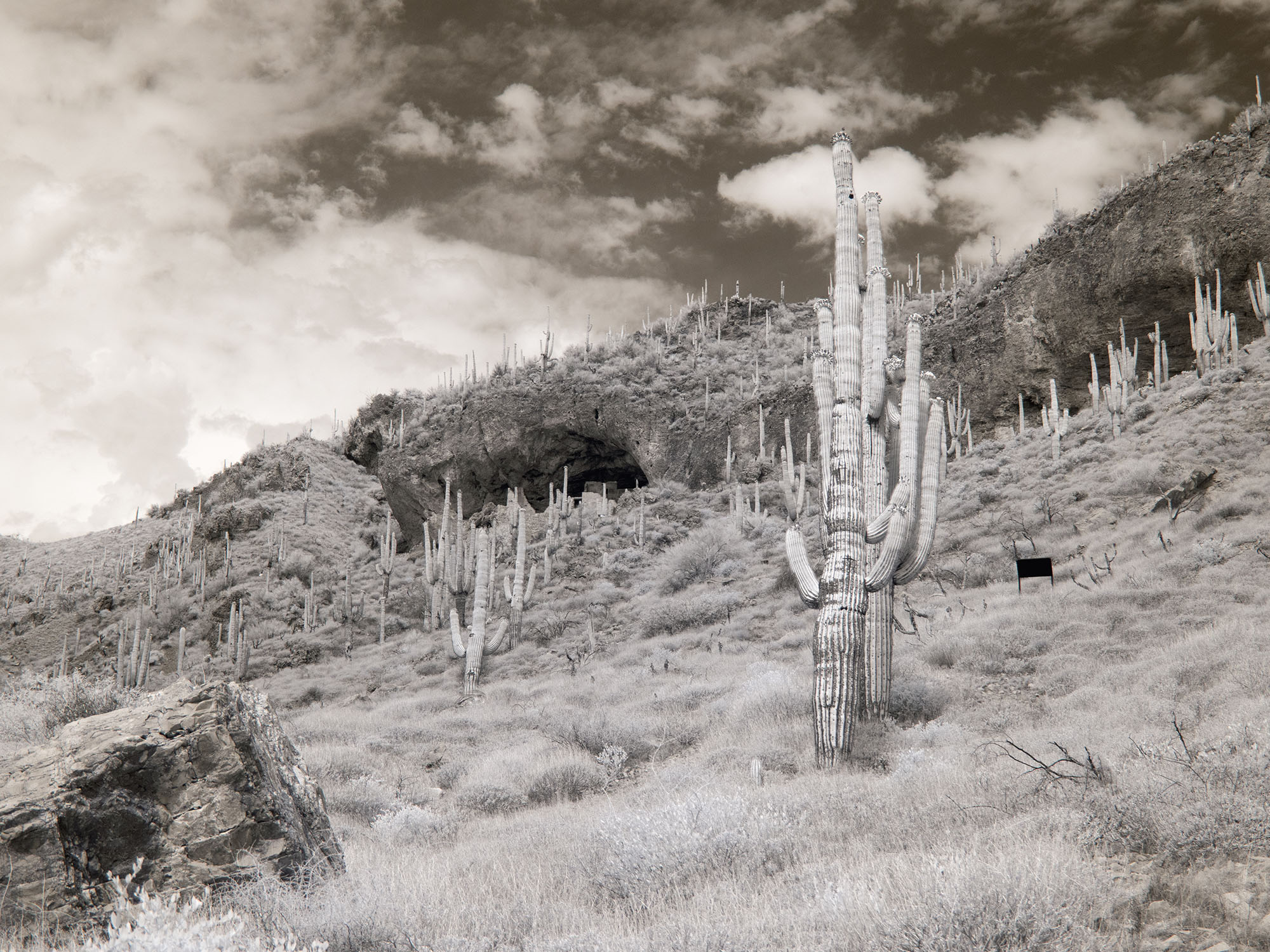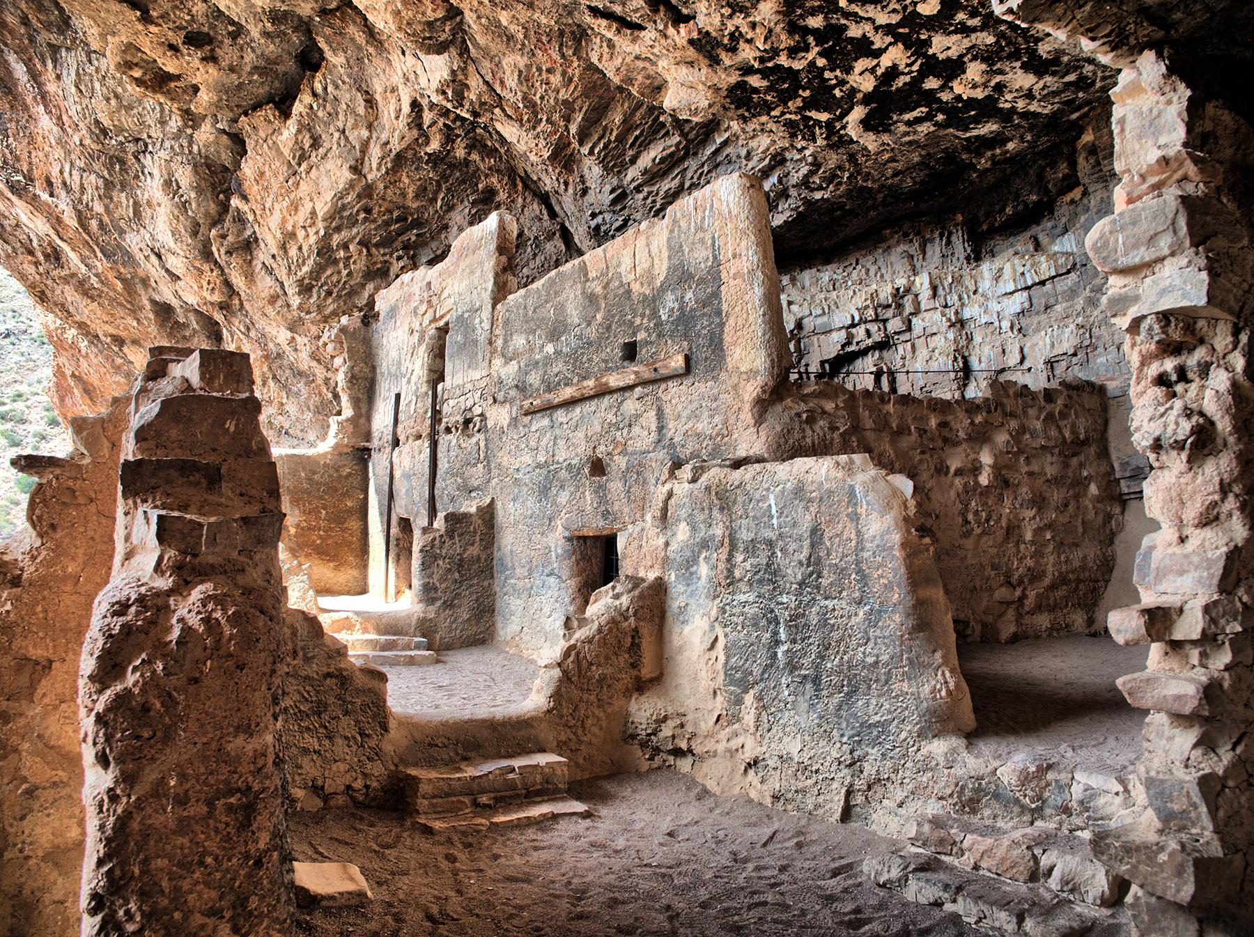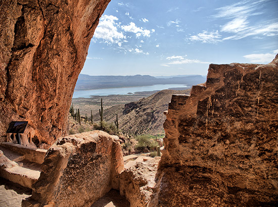 Tonto National MonumentTonto National Monument is the location of cliff dwellings of the Saldado, a mixed origin peoples derived from ancestral Puebloan, Mogollon and Hohokam immigrants to the Salt River (Tonto) Basin and mixing of culture/practices with inhabitants that settled as early as 700 CE. The Saldado culture flourished between 1250 and 1450 CE. They built cliff dwellings in recesses of quartzite and were skilled hunter-gatherers and farmers growing cotton, corn, beans and squash with the aid of irrigation canals that they built. They dispersed into other populations and vacated the cliff dwellings after what is currently hypothesized to be flooding that made agriculture untenable. However, other factors may have been important (e.g., periods of drought and/or hostile invaders). |