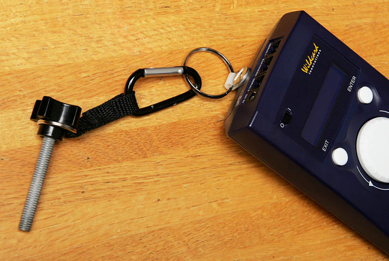![]() A key clip with strap is used to attach the Argo Navis to the upper cage via the knobbed assembly bolt. |