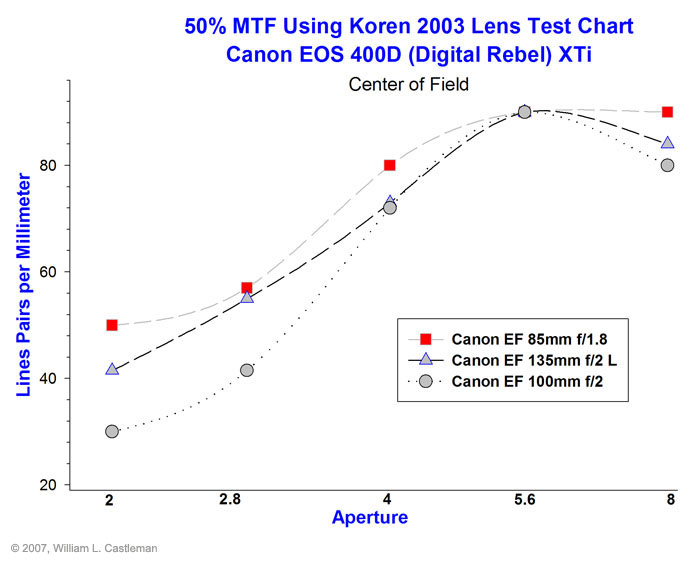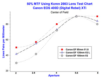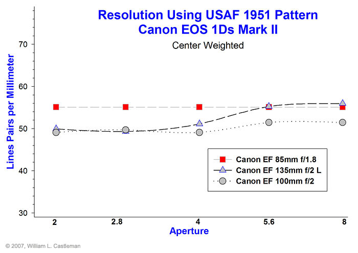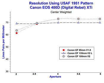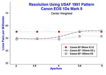 ![]() The EF 135mm f/2L lens has the best resolution at f/2. |