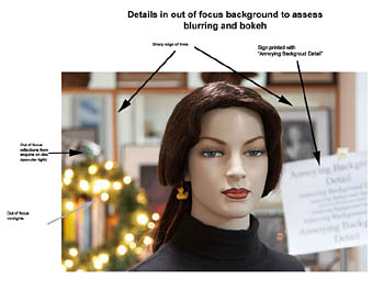 The lenses were tested with a mannequin and a background containing printed letters, minilights, and sequins (source of specular light) and shelf framing to test the ability of lenses to blur background and produce bokeh. The following lenses with focal length settings and apertures were tested: