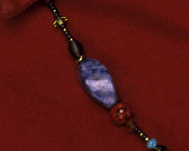 Comparison of EOS-1Ds Mark II against EOS-1Ds on same day. Other images shot on two other days: EOS-1D Mark II, 35mm format, 6x7 format. The main objective was comparison of image detail. There are variations in exposure, color balance, and contrast introduced by the photographer. Image detail cut from negative scan or raw converted file at 300 dpi. Cropped section converted to 72 dpi 800 x 640 pixel image. Canon images shot with Canon 50mm f/1.4 lens at f/11 for digital cameras at ISO 200 and f/8 for Astia at ISO 100. Mamiya 7 used with 80mm f/4 lens at f/8 with Astia. Negatives scanned on Nikon 4000 ED and Nikon 8000 ED scanners with autoexposure function and post-scanning levels, contrast and brightness. All images subjected to varying levels of sharpening for maximal sharpening without gross distortion. The 6x7 negative format image was cropped because the lens was working at minimum focusing distance and was still not achieving full frame of head and chest. The test with the EOS-1D Mark II was run at a second time under approximately the same lighting conditions. The shirt had been washed 3-4 times and had lost some of its even texture and color. White balance was set with a grey card for the EOS-1D Mark II. The tests with the EOS-1Ds and 1Ds Mark II were run at a 3rd time with similar soft box and triflector, but no hairlight or background and background light. White balance is custom set off grey card.