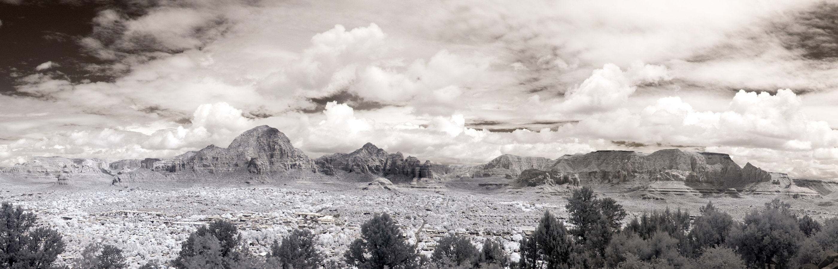 The Mogollon Escarpment as viewed from Sedona Airport Scenic Overlook. The red cliffs around Sedona are predominantly composed of Schnebly Hill Formation sandstone which formed in shallow warm seas 298 to 273 Ma during the early Permian Period. The red is due to coating of sand in the sandstone by hematite (iron oxide). Coconino Sandstone visibly tops the red cliffs in many areas. |