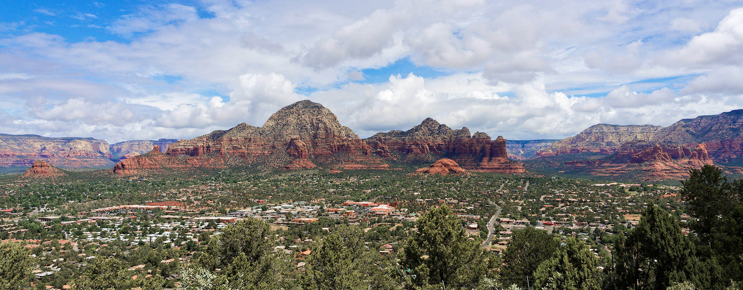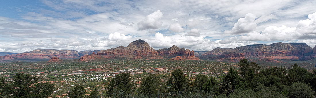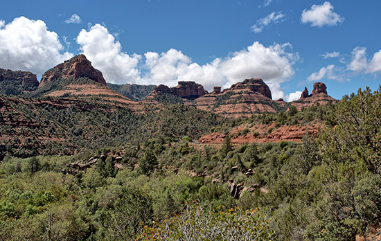 The view of red cliffs bordering Sedona from a pullout along AZ 89A entering Sedona. |