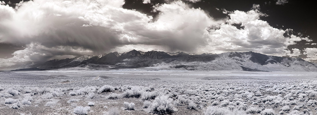 Eastern face of the Sierra Nevada along US 395 near Bishop shot with an infrared camera. A third important event in the formation of the Sierra Nevada to its current appearance was glaciation over the last 2 Ma with carving of the granite batholith and removal of most of the remaining sedimentary and metamorphic rock that covered the batholith. |
