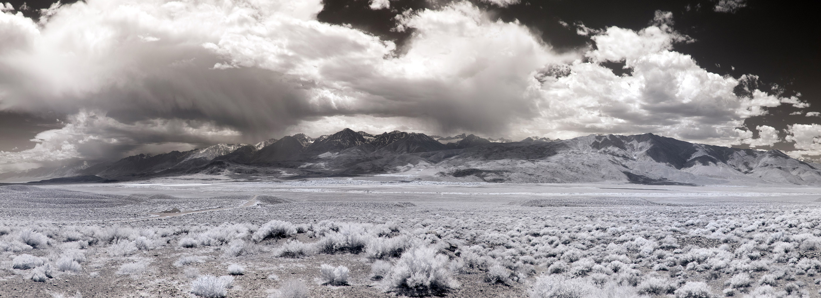 Panoramic view of the Eastern Sierra Nevada from Big Pine Vista Point. I drove from Beatty NV through Westgard Pass between the Inyo and White Mountains on CA 168 through stunning volcanic terrain before stopping at this beautiful vista point. |