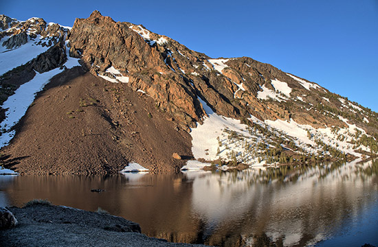 Eastern Tioga Pass at Ellery Lake. Remnants of a roof pendant (Saddlebag Roof Pendant) is shown in early morning light. This is Paleozoic metasedimentary/metavolcanic rock that covered the magma chamber that formed the batholith, and heat and pressure metamorphosed the rock. It was lifted with the batholith when the granite was lifted and was incompletely eroded over millions of years. |