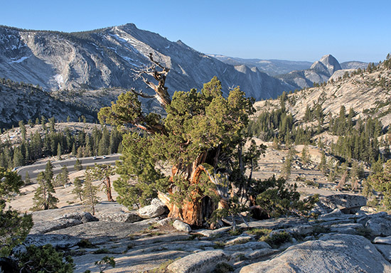 The exposed granite batholith at Olmsted Point with a Western Juniper tree growing out of the granite in the foreground and the top of Half Dome visible in the distant right of the field. |