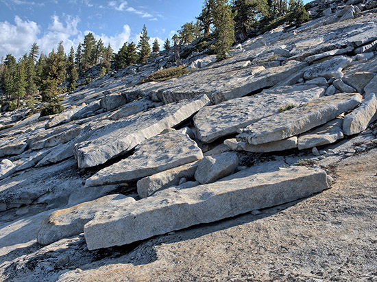Exfoliated granite due to water and ice formation cleaving granite layers. Above Tioga Road west of the Yosemite Creek crossing. |