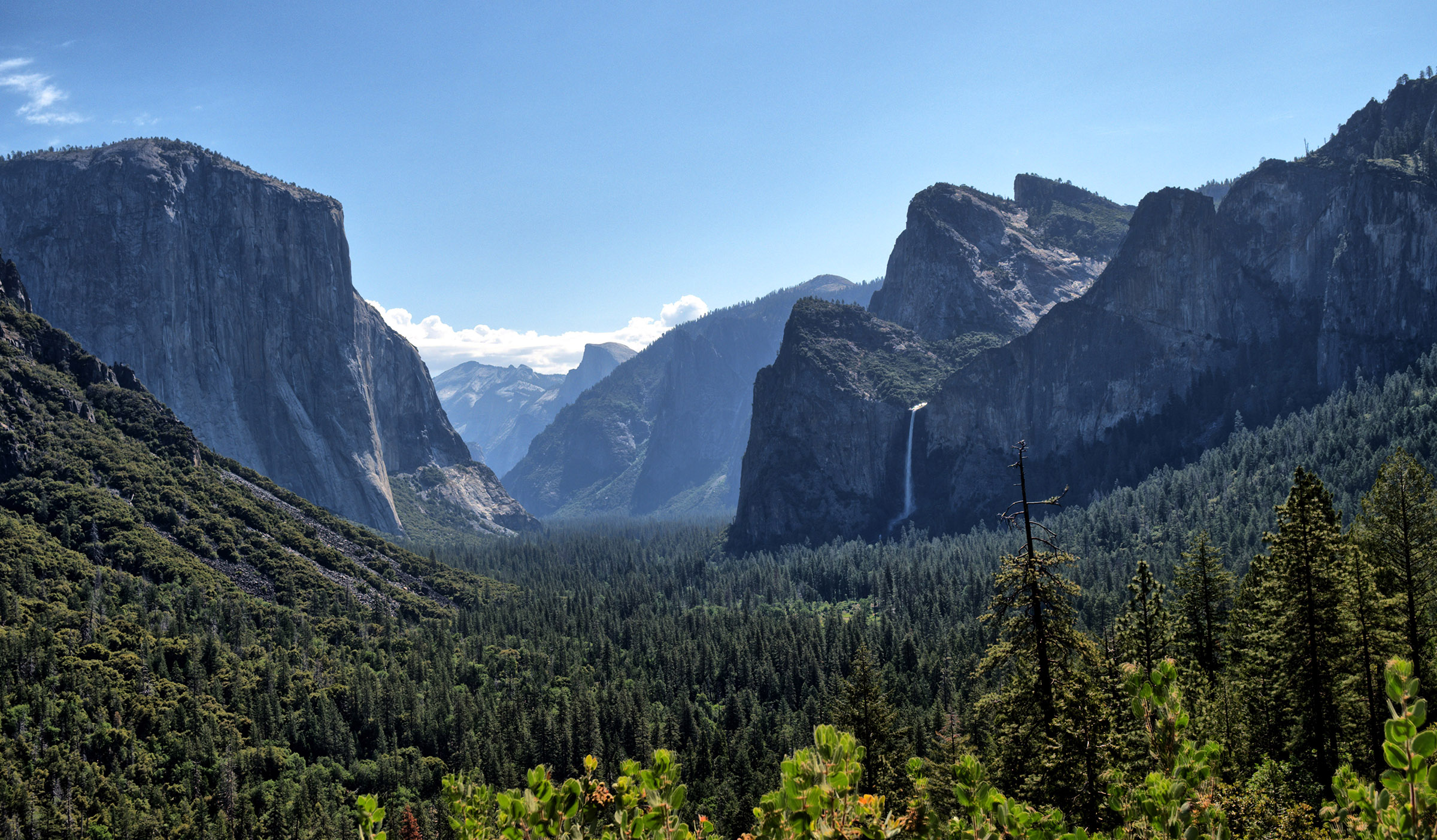 Yosemite Valley from Tunnel View Overlook. I stopped here driving out of Yosemite to join approximately 100 other visitors snapping photos from this viewpoint. I fled from the crowds visiting this glacially-carved and water-eroded batholith wonder. |